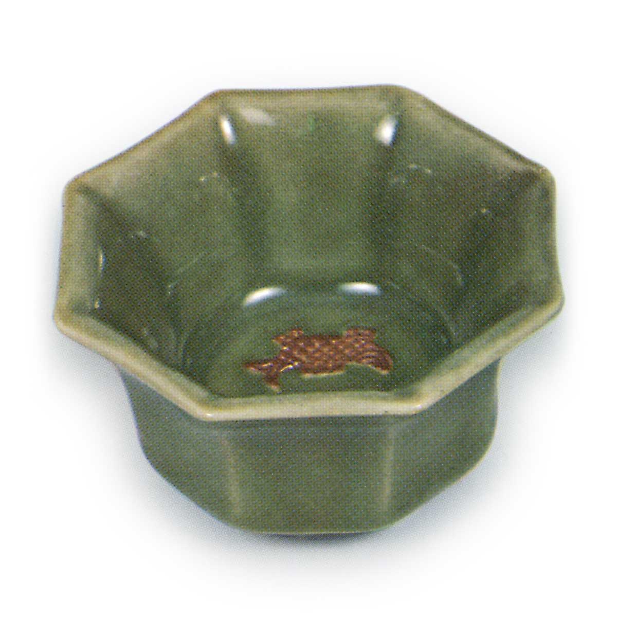 青瓷双鱼纹八角杯 京都烧青瓷双鱼纹八角杯 2026.03.16 青瓷双鱼纹八角杯 高4.3厘米 口径6.6×6.6厘米 底径3.0厘米这是一款边缘外翻的八角形杯,杯内侧以烧紧工艺呈现双鱼纹样,仿制天龙寺青瓷风格,高台背面刻有“金府”铭文,系金泽春日山窑烧制。