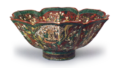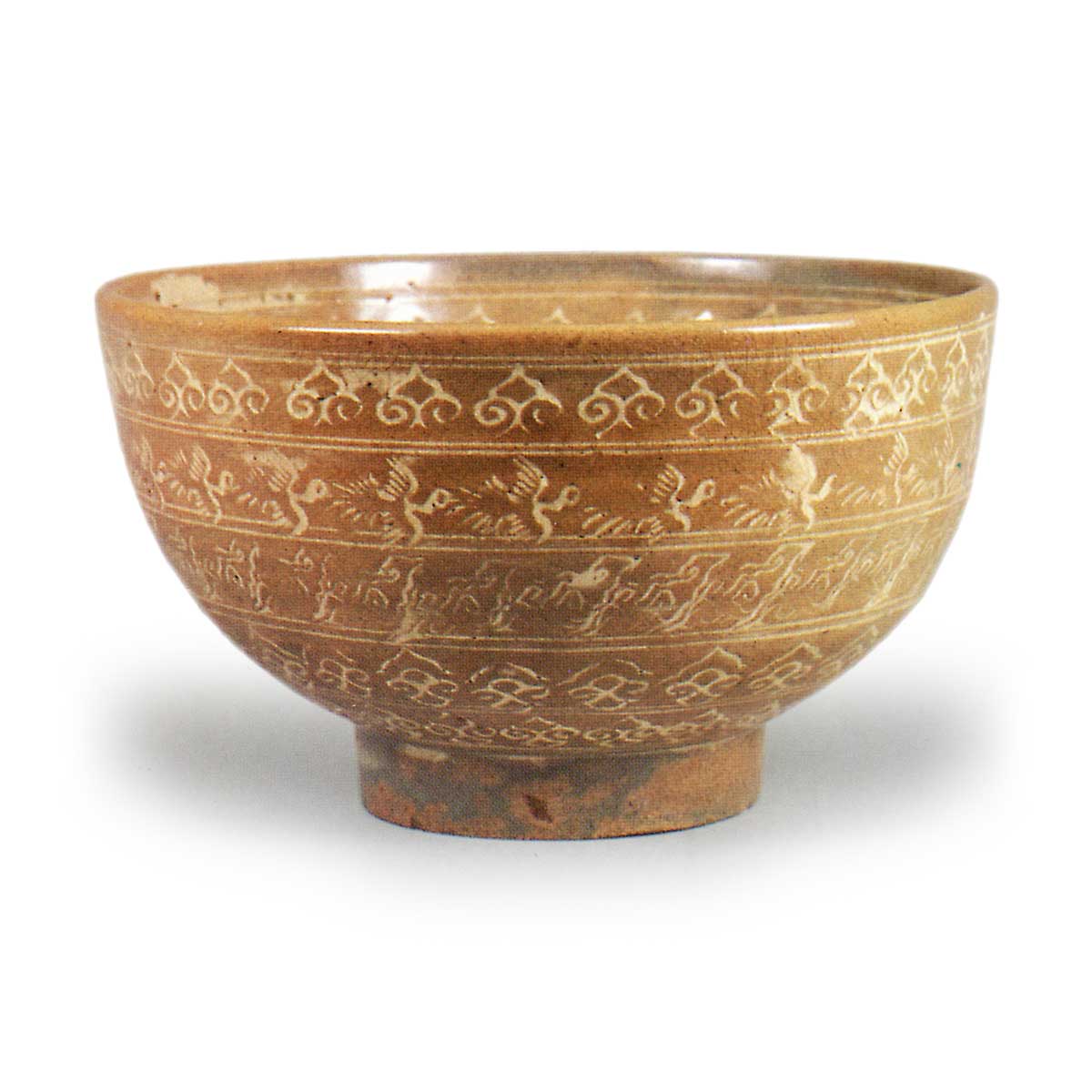 御本云鹤写碗 京都烧御本云鹤写碗 2026.03.18 御本云鹤写碗 高10.1厘米 口径16.4~16.9厘米 底径7.5厘米此为御本手风格的云鹤图案,外壁以白镶嵌工艺环绕五层飞鸟等纹样,表面施以透明釉,但釉色烧制后呈褐色。高台与内壁上各刻有三个凹痕。虽无原装盒,但附有木米之女所书写的箱文。盖内侧写有“因父佐兵卫之作,未及添饰,故仅此留印”,盖外侧亦由同一人书写“云鹤”二字。