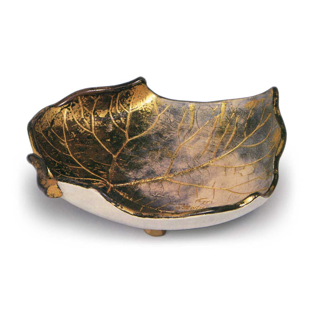 这是一款将桐叶巧妙意象化的平盘,底部三面设有支脚。俗称“桐叶盘”,被列为仁阿弥道八的代表作之一。通过线雕刻画桐叶叶脉,将叶尖向内收拢制成平底碗,叶柄则采用浮雕工艺。碗内壁巧妙地运用钴蓝与铁彩,以晕染般的手法分色涂绘,生动展现了枯叶的意境;施以透明釉烧制后,再添以金彩。内壁上盖有“桃山”的瓢形印章,此印章是晚年将家业传给长子三代道八,隐居于伏见桃山江户町并创立桃山窑后,其作品上所盖的印章。底面中央盖有法螺贝印章。
