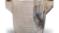 半身釉瓢形水指 京都烧半身釉瓢形水指 2026.03.19 半身釉瓢形水指 高15.4厘米 口径12.1厘米 底径8.2厘米滴翠美术馆仁阿弥道八于天保年间在京都嵯峨角仓玄宁的别邸开创了一方堂烧,此作即为一方堂烧的杰作。这亦是仿仁清风格的倒瓢形水指,很好地捕捉了原作的韵味。铁釉与白浊釉以片身替的方式交替施釉,釉面融汇得十分平滑。平底左侧印有一方堂烧特有的瓢形印章。