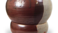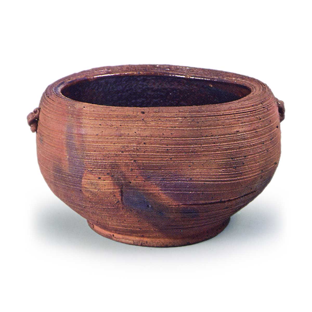 这是一款整体呈椭圆形的平口水指,造型仿照“姥口”风格,底部收窄,两侧配有小耳。外侧采用烧紧工艺,清晰呈现出丝状的轆轤纹,内壁整体涂有铁釉,很好地再现了南蛮器物的风韵。在仁阿弥的南蛮仿作中,这件应是最杰出的作品。底部的左侧清晰地刻有“道八”的铭文。