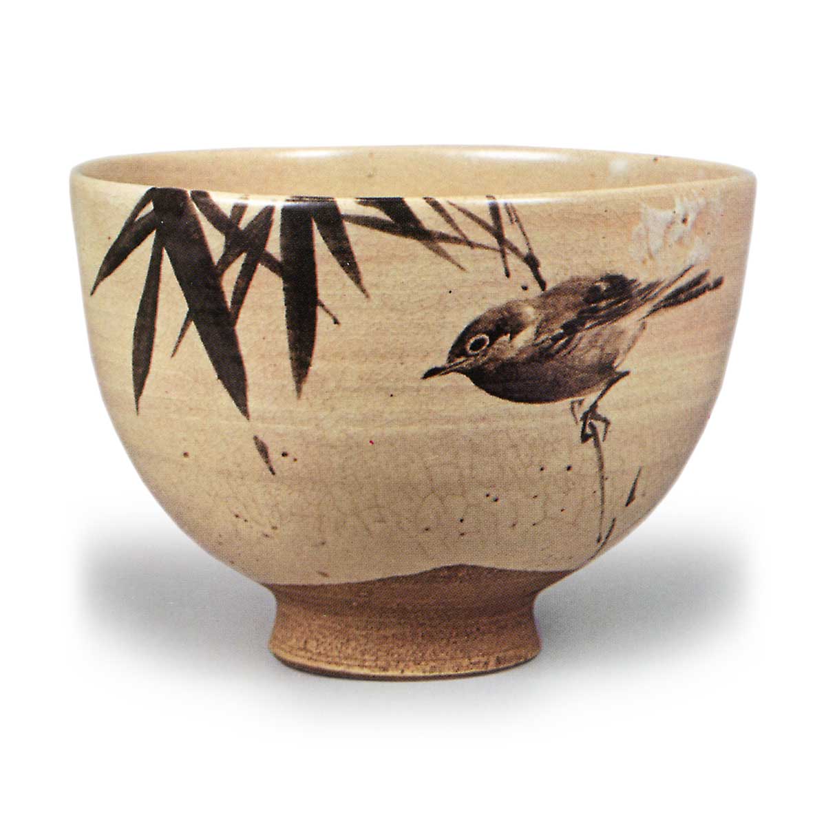 原装盒盖内侧题有“仁清形茶器 仁阿弥印”字样,并盖有葫芦形印章;这确实是一款仿仁清风格、造型流畅的茶碗。这属于所谓的吴器形,高台向外展开,高台内侧被削得圆润深邃,中央立有一道兜巾纹。器身表面绘有竹林与黄莺的图案,但绘制者并非仁阿弥,推测应是同时代画家的绘制。除高台周围外,器身全面施以泛黄的白色釉。