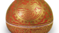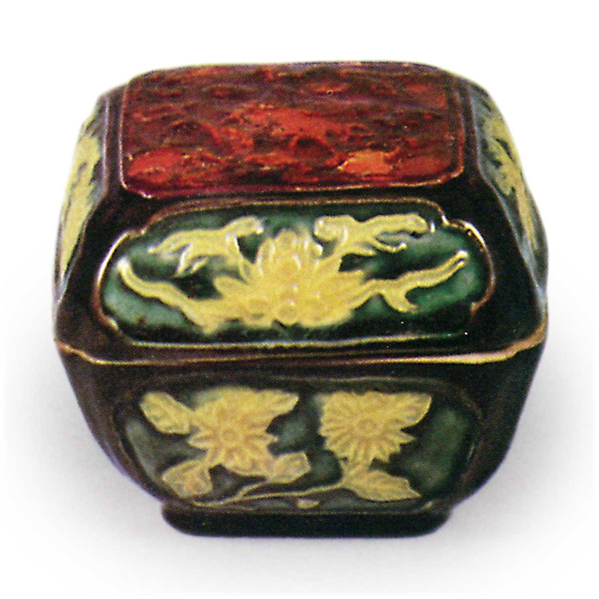 交趾写额梅香合 京都烧交趾写额梅香合 2026.03.28 交趾写额梅香合 高4.4厘米 口径4.0×4.1厘米 底径2.8×2.9厘米在交趾烧造型香合中,有一种被称为“额梅”的香合。这款香合既借鉴了额梅的造型,又运用白檀涂技术在盖面打造出别具风味的质感。这是一款四方入角的香合,壶身与盖子的侧面饰有菊花和牡丹的浮雕纹样,并以紫、黄、绿三色上釉区分。盖面同样以浮雕技法描绘梅树,其上覆以金箔并涂以琥珀色漆。高台内侧盖有永乐印,壶身与盖内侧均施白釉。原装盒盖面题有“交趾写额梅香合 善五郎造”字样。