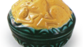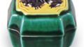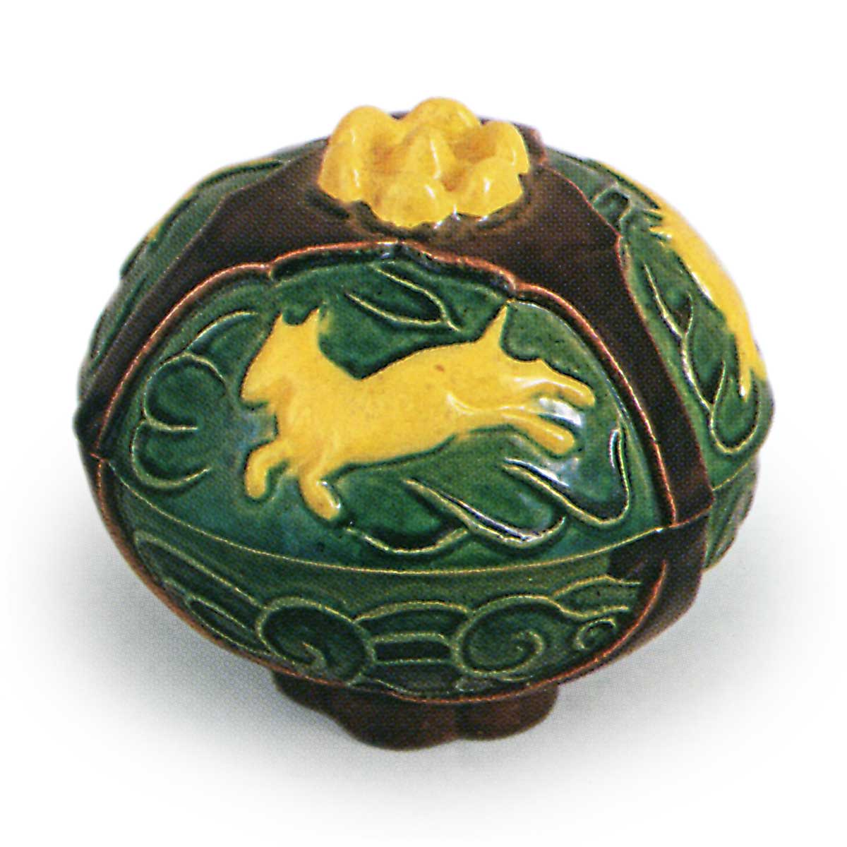 仿交趾石榴香合 京都烧仿交趾石榴香合 2026.03.29 仿交趾石榴香合 高5.8厘米 口径5.0厘米 底径3.0厘米此香合亦是仿制交趾石榴香合之作。器身分为三面,各面饰有火焰马纹。绿、紫、黄三彩分色施釉,色彩均十分鲜艳。六瓣花形高台内侧盖有“永乐”印章,配套盒盖正面题有“柘榴香合”,盖内侧则题有“善五郎(花押)”。