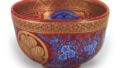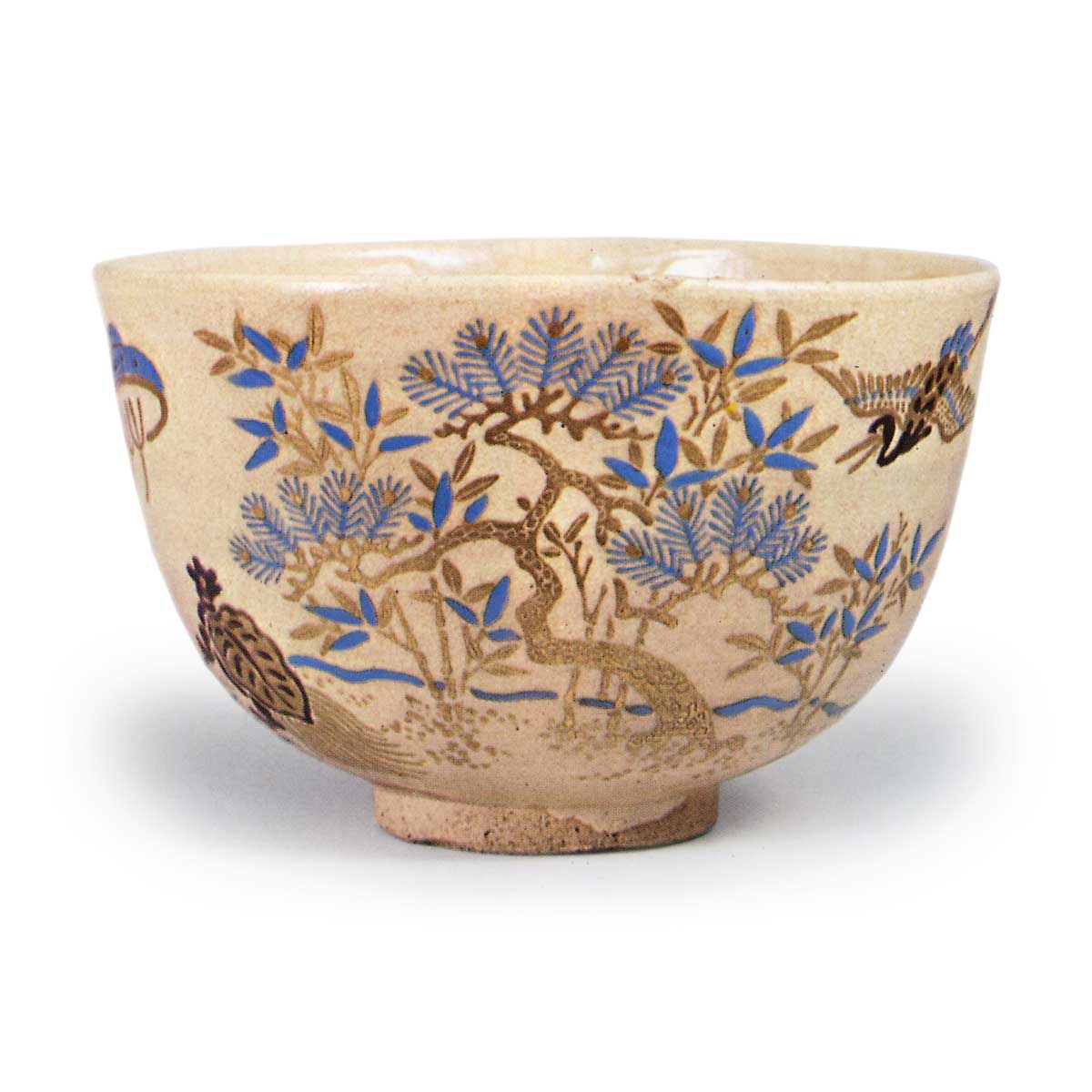 彩绘宝尽纹茶碗 京都烧彩绘宝尽纹茶碗 2026.03.30 彩绘宝尽纹茶碗 高7.7厘米 口径11.3~12.0厘米 底径4.5厘米此茶碗亦为仁清仿作。碗口一侧略呈歪斜,为内深的外掏式碗形,高台小巧紧致。除高台侧面及高台本身外,整体施以淡朽叶色的透明釉,碗身一侧绘有松竹鹤龟,背面则点缀着注连绳、散梅花及宝尽纹样。这只茶碗的纹样与表千家传下来的图4所示京烧茶碗完全相同,很可能是保全应委托而仿制的。高台侧面盖有“永乐”印章。盒盖正面写着“宝尽 仁清仿制茶碗”,盖底则写着“善一郎造”。