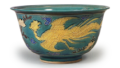 图222的制作尺寸比前两件更为小巧,忠实再现了所谓的“魁”碗。深红与深绿的色调中,碗底中央的圆形纹样内绘有“魁”字,侧面则向两侧延伸出莲花纹,外侧以随意笔触描绘了牡丹、菊花和凤凰。高台内侧盖有“河滨支流”的印章。