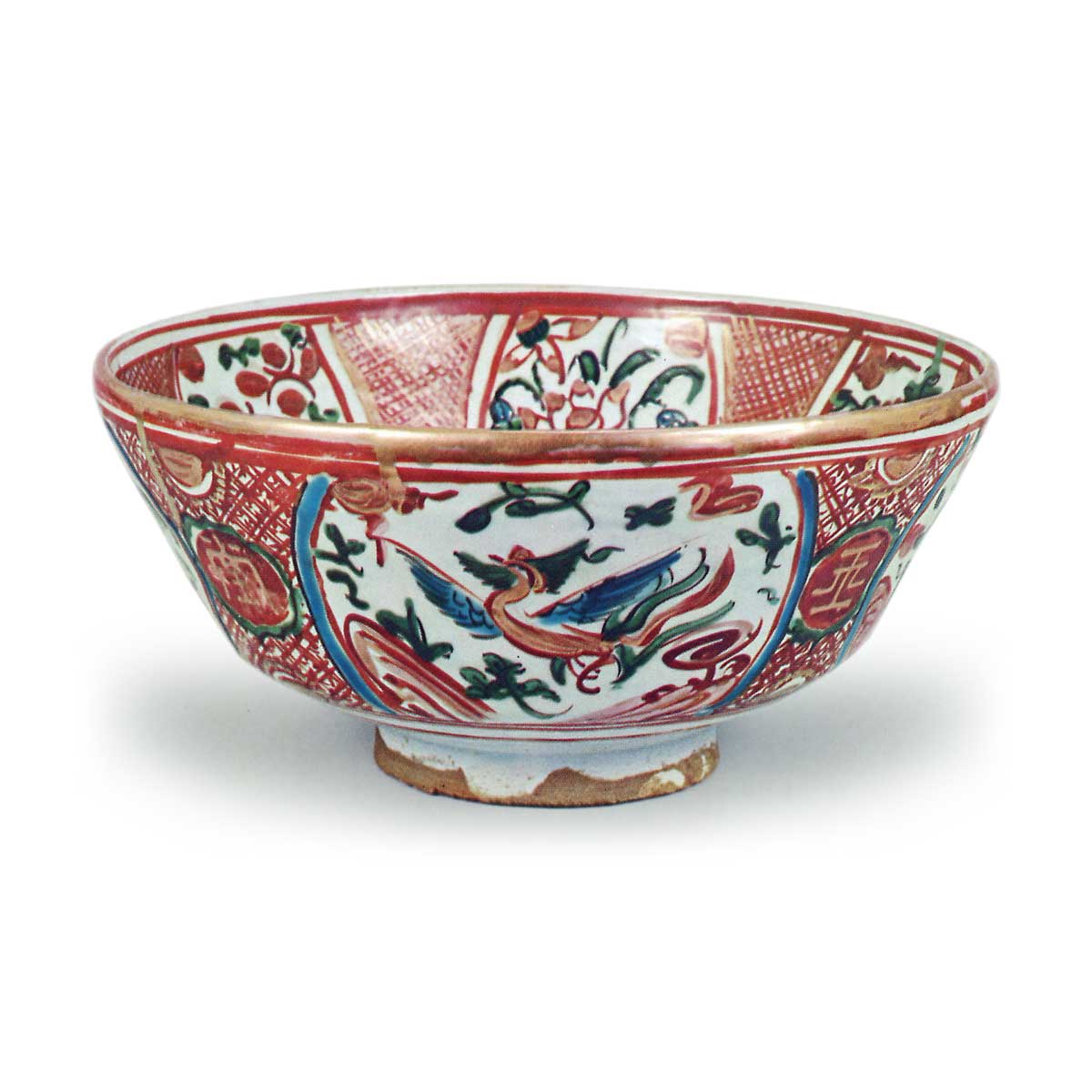 图220所示的碗,碗身与口沿略微收拢。高台采用露胎工艺,底釉施以厚重的带青色调的白釉。碗内中央,在金彩圆纹内以青、红两色绘有“福”字;碗身侧面划分为六格,交替使用红、金、绿、青、黑五色上彩,描绘草花纹与细密的斜格纹。