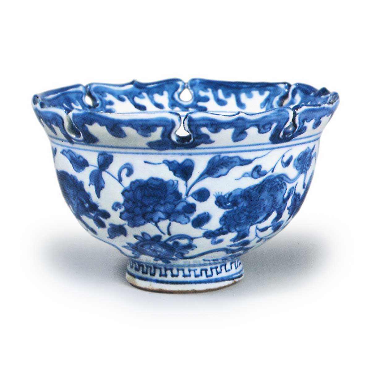 青花狮子牡丹纹雪轮碗 京都烧青花狮子牡丹纹雪轮碗 2026.04.01 青花狮子牡丹纹雪轮碗 高8.5厘米 口径13.5厘米 底径4.8厘米这是一款碗口呈雪轮状的小碗。碗口收紧,内壁较深。内壁绘有单脚站立的鹤,碗口边缘饰有波纹,外侧则以浓郁的青花绘有玉取狮和牡丹纹。高台内同样以染付技法,在双重圆圈内书写着“大日本永乐造”字样;原装盒盖正面标注“染付雪轮小碗”,盖底则标有“保全造”字样。