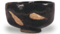与长次郎烧相比,道入的茶碗整体成型较为纤薄,尤其是这款茶碗的口沿,正如俗称的“蛤蜊口”那样制作得十分纤薄,且略向内收拢。碗底大胆地设计得宽阔而大,从这宽阔的碗底以及从腰部到高台的圆润弧度中,可以窥见道入独特的制作风格。黑釉在腰部周围较薄,从口沿到胴体逐渐变厚,宛如垂幕般的意趣,因此被称为“道入的幕釉”,成为一大看点。另一方面,胴体下缘有部分未施黑釉,呈山形,其上薄施透明釉,泛着微黄。这也是道入惯用的手法,显然是为了追求装饰效果。高台周边基本呈三角形裸露陶土,虽然此类裸露陶土的高台在常庆的部分茶碗中已有先例,但将其作为一种刻意技法来运用则始于道入。此外,高台上的五个陶土痕迹处附着黑釉,这也是道入的特色。该茶碗曾为大阪商人粋屋所有,后辗转传至赤星家、矶野家。
