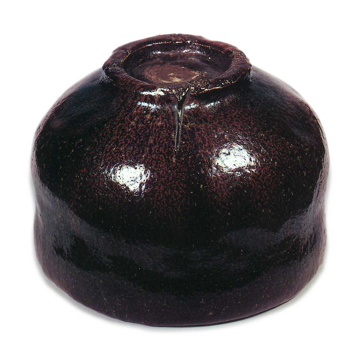这款茶碗的独特之处在于,内外覆盖的漆黑光泽釉面中,呈现出深浅不一的朱红色窑变,尤其是碗缘部分的朱釉尤为鲜艳。虽说朱釉被视为道入长子一入所作黑乐的特色,但可见其父道入晚年时已开始尝试,此外还见过两三件出现朱釉的作品,如《小鹰》(图5152)等。《闪电》是道入黑乐中独具一格的一件。属于“Nonkou七种”之一。