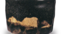 内盒盖内侧有禄禄斋题写的“红茶碗 吉左卫门作 左(花押)”。毋庸置疑,此作应为庆入自称吉左卫门时期,即弘化二年(据传作品始于同三年)至明治四年的间所作。虽不及剃发后的代表作《入舟》(图30)那般精妙,但作为吉左卫门时期的作品,堪称典型之作。据传选自安政元年至明治四年间使用的董其昌法帖中的“乐”字印章,被印于高台内侧;此印俗称“中印”,作为带有中印的茶碗,这件作品应属早期之作。口沿微微内收,形似起伏平缓的五岳,整体呈半筒形。高台侧面设有台阶,腰部环绕笼纹,胴部施以纵向纹路。另一方面,内外均呈现出绿褐色的火变色,且在素地之上涂抹的黄土刷痕,在红色釉面上留下了黄色痕迹。