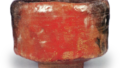 内盒盖内侧有惺斋宗左题写的“弘入作 黑筒、茶碗 数印 铭雪山 左(花押)”。此为印尽茶碗,是弘入所作黑茶碗中的佳作。碗口呈圆内收造型,宛如起伏平缓的五岳,至腰部逐渐收窄,从腰部到高台处保留圆润感,形成高腰造型;高台尺寸较小,高台内侧轻微削出巴形兜,并在腰部刻有纵向纹路。黑釉质地光滑且熔融均匀,但在壶身下缘保留了远山风格的釉色错落,并在该处施以透明釉。想必正是因这般景致,才将其命名为“雪山”吧。壶内有半圆形的茶洼,更难得的是,除伏见宫受赠印外,弘入生前使用的所有印章均印于裸露陶土的高台周围。
