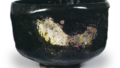 然而,道入的独特笔触随处可见。整体制作轻薄,口部向内收拢,胴部缓缓隆起,从高台边缘到腰部的圆润感正是道入的独特之处。高台略高,底座宽阔,高台内部未施涡兜巾釉。内壁无茶洼,制作宽阔丰满。覆盖在器身上的釉色漆黑且熔融均匀,从口沿到器身全面覆盖着厚实的幕釉。高台底座处有明显的粘连痕迹,胎纹已不甚分明。箱盖内侧由啄斎题写着“道入作 黑茶碗 木下(花押)”。