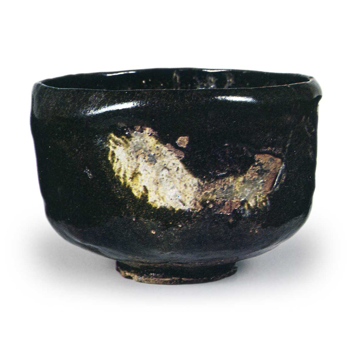 整体壁薄,口部微微内收,碗身略显丰满,腰部稍收,但从腰部到底座的圆润感具有道入独特的风格,底座为露土底,底座内印有“乐”字印章。黑釉涂层厚实,部分形成幕釉效果,但碗身一侧有大片釉面脱落,该处虽似曾施以白釉,但釉料可能因开裂而露出陶土肌理,作为道入作品,这是一款釉色分布颇为罕见的茶碗。高台叠口细窄,高台略显小巧。此器曾为松平不昧所藏,笔触鲜活有力,盖面题有“黄鹤楼”,盖底则由不昧亲笔题写“道入 黑茶碗(花押)”。