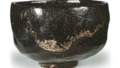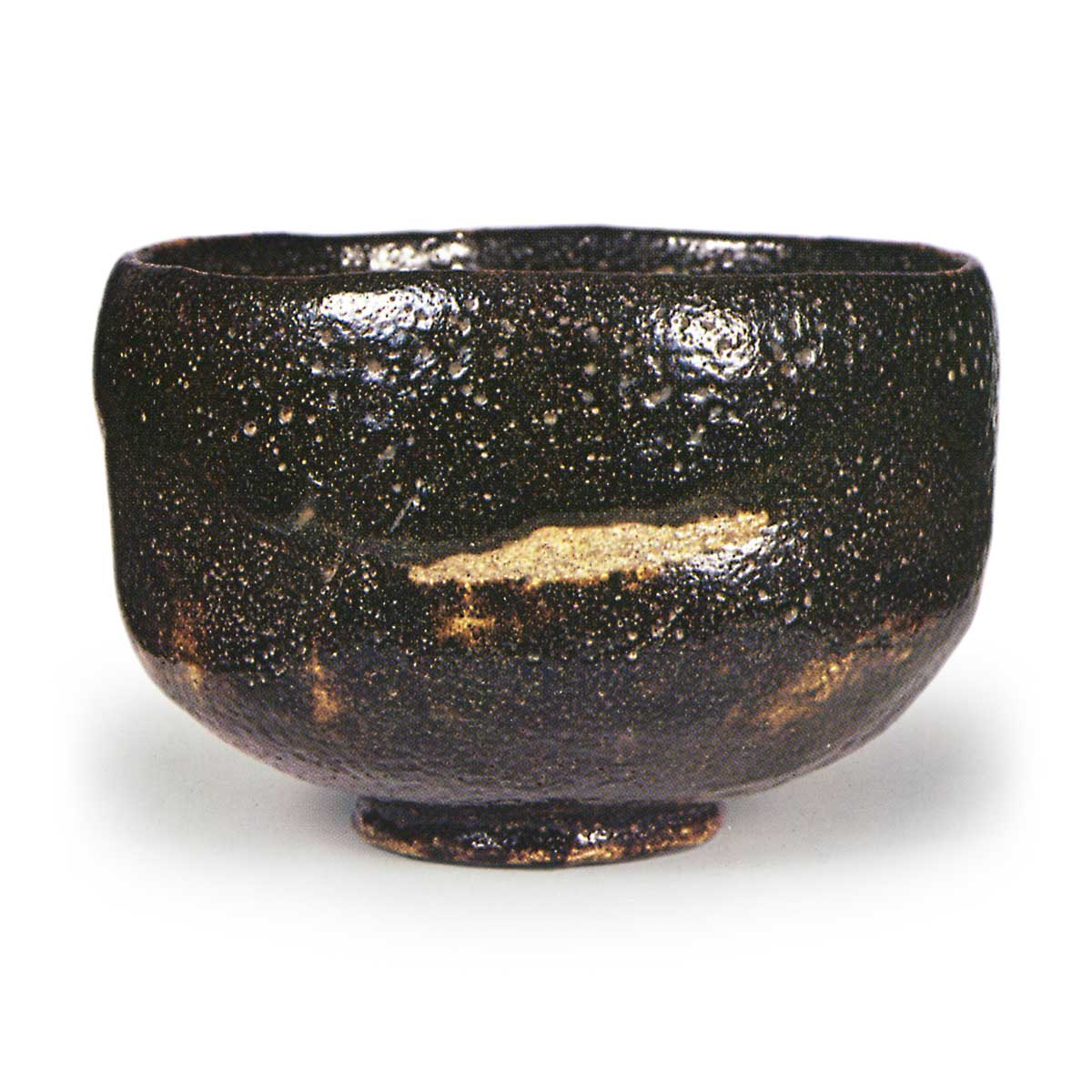 虽然器形与题名“残月”的黑茶碗相似,但底座较细,底面平坦,底座内侧盖有“乐”字印章。通体施黑釉,外侧有釉滴垂落,部分釉裂呈细长状,露出黄色底釉。盖底由啄斎题写“道入黑茶碗 残雪 左(花押)”,外箱由了入题写“道入作 黑茶碗”。