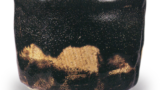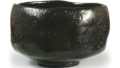 这是一款平茶碗,从腰部到口部略微收窄,腰部曲线分明,底座的制作风格与黑釉茶碗“若绿”完全一致。口部呈椭圆形略有歪斜,内壁圆润宽阔。整体黑釉厚实,腰部周围数处釉液呈圆形积聚。高台上有五处釉痕。内盒盖内侧由了了斋题写“道入黑茶碗 钟湖号 左(花押)”。
