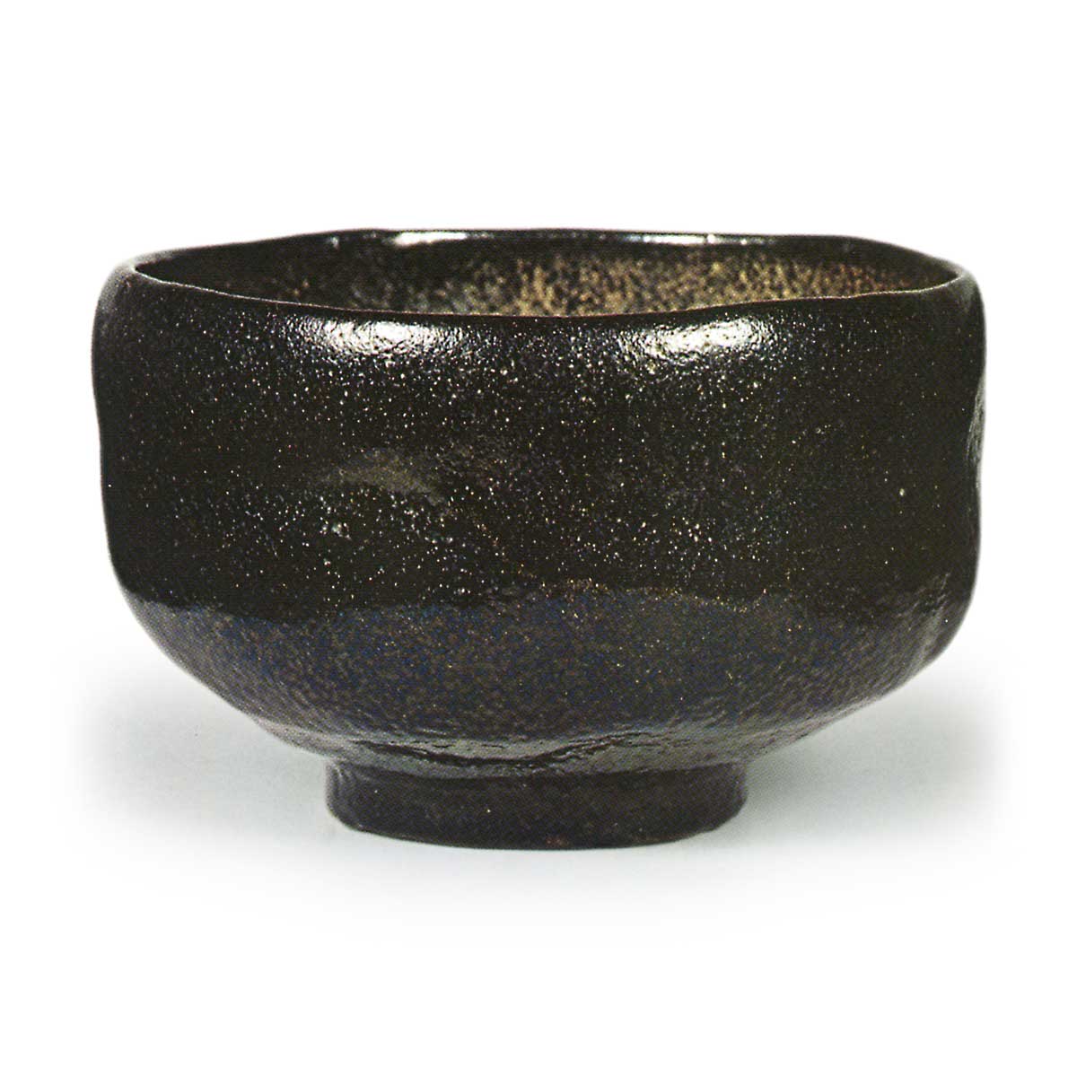 黑茶碗 题名“老松” 这是一款风格与“老松”相似的茶碗,口部微微向内收拢,碗身浅而紧致,腰部略显圆润,高台稍高。釉层厚实且熔融均匀,整体风格沉稳内敛。高台内侧斜着盖有印章,但因釉层较厚,印迹并不清晰。有五处釉痕。内盒盖内侧有如心斎题写的“能光黑茶碗 残月 左(花押)”。