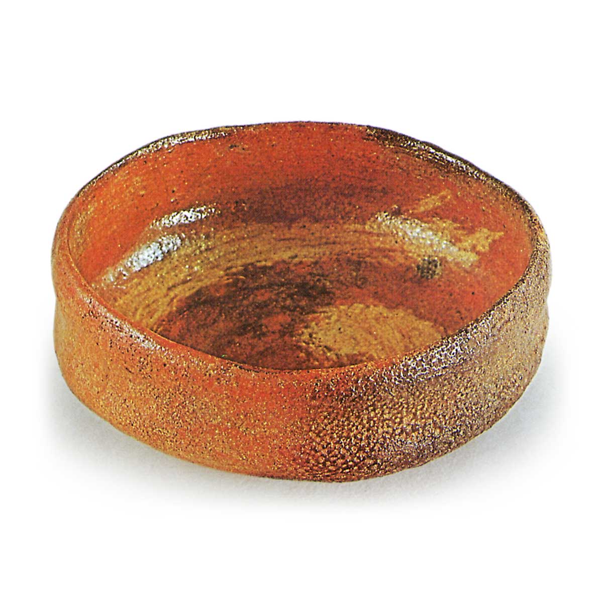 这是一款所谓的马盥形平茶碗,是以利休所钟爱的长次郎烧平茶碗为基础制作的。因此,道入独特的个性化手法并未过多体现,其内收的碗口造型、腰部的张力以及底座的构造等,均承袭了长次郎烧的风格。高台低矮,底面宽阔,高台内侧被削成圆润浅凹的形状,内壁以白刷毛技法清晰鲜艳地描绘出“巴”字纹样,其上施以透明釉的赤乐釉,而外侧一面呈现出蓝色窑变的釉面,呈现出褶皱状。内箱盖面题有“巴”字,盖底官休庵二代文叔宗守的题跋中写道:“吉兵卫烧 平赤茶碗 巴字一字宗旦笔也 宗守(花押)”,由此可知“巴”字确系宗旦所书。此外,外箱盖内侧还附有直斋所写的题记:“道入赤平茶碗 文叔箱书附 亦有‘ヘ’字一字之箱 此应为宗旦笔迹 宗守(花押)”。此器原为宗旦所有,后传至官休庵,明治时代起成为藤田家的藏品。