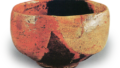这件作品很可能是道入早期创作的赤乐茶碗,其器形似乎仍以长次郎烧为基础。口部微微内收,胴部收紧,腰部既保留了圆润感,又略显高腰。高台削制得十分利落,高台底面平整,高台内侧清晰地印有“乐”字印记。在素坯上用毛笔涂抹黄土,其上再施釉,釉色呈现出宛如糖釉般的变化。此外,从器底边缘至器身部分可见局部火变,另有一处显现出黄色毛笔痕迹。这是道入红乐茶碗中的代表性作品之一。内箱盖内侧由一灯题写“道入红茶碗 寒菊(花押)”,外箱则由不见斋石翁题写“道入红茶碗 又玄斋题写 寒菊(花押)”。