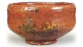 左 (花押)» 这款茶碗虽与该系列其他作品风格一致,但在深碗底处设有蓄水凹槽。整体烧制为明亮的赤乐釉色,但作为道入的赤乐茶碗,其釉土层似乎略显厚重。表面覆盖的透明白釉部分呈现如薄雾般的白色斑驳,高台内侧压有“乐”字印章。内盒盖内侧由如心斋题写“道入赤茶碗 左(花押)”,盖面则由啄斋题写“道入赤茶碗 如心斋书付 左(花押)”。