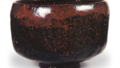 碗身笔直挺立,口部造型简洁,腰部以下呈圆润状,是仿照所谓利休形长次郎茶碗而作的一入风格作品之一。小巧紧致的高台圆润饱满,高台内侧刻有素雅的兜巾纹样,高台底面留有三处釉痕。整体施釉熔融均匀且富有光泽,碗身一侧及内壁部分可见朱釉。盒盖内侧有“一入作黑茶碗 东云(花押)”的题跋,字迹工整。
