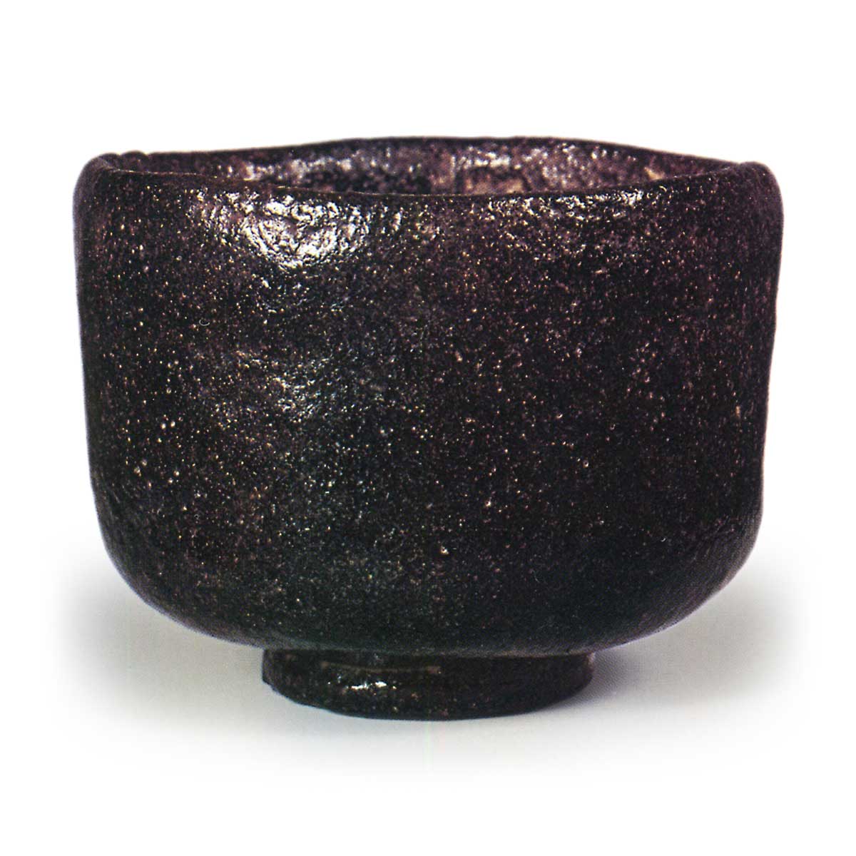 这是一款从腰部到口沿微微外张、口部呈缓和起伏并向内收拢的半筒形茶碗,想必也是仿照长次郎的茶碗制作的。高台较为小巧,其制作风格与高台内侧浅削的“一入”茶碗相似。覆盖全碗的釉料,外侧部分呈现出釉皮质感,其余部分则熔融均匀且富有光泽。此外,内壁釉面出现釉裂,留有较大气泡形成的孔洞。此茶碗由与宗入同时代的觉觉斋原叟题写“宗入黑茶碗 号名 鸦羽(花押)”并附于盒内,外盒上则由了了斋题写鉴定文。