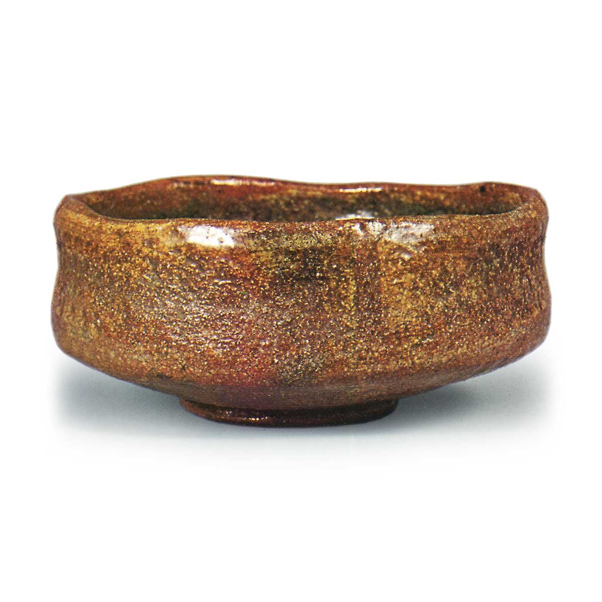 这是一款造型宽大的平茶碗,口部高低起伏,碗身略收,腰部外扩。底座采用宗入独有的宽阔叠层式高台,高台周围饰有箟雕纹。此外,高台侧面三处添加的粗箟雕纹,连同高台侧面的箟雕处理,均体现了仿效长次郎的制作风格。通体施以砂釉,黄土色的斑驳形成丰富变化,碗内壁的釉下则呈现出浓郁的火变色。了々斎题写道:“宗入作赤平茶碗 青海波号 左(花押)”。