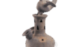 这是一种模仿用水皮缝合而成的水瓶的壶。它是在6世纪后半叶至7世纪前半叶的古代墓葬中发现的。制作方法是:在陶轮上转动一个平底碗状物体,将其边缘对折,在顶部钻一个孔,然后连接一个瓶颈,在带子的两侧贴上薄薄的粘土条,并在中间压入竹管,以表示缝合水皮。 此外,在带状物之间压入五根或七根竹管,形成一圈装饰图案。缝制皮革制成的液体容器最初是由东北亚的游牧民族使用的,但两者之间的关系并不完全清楚。