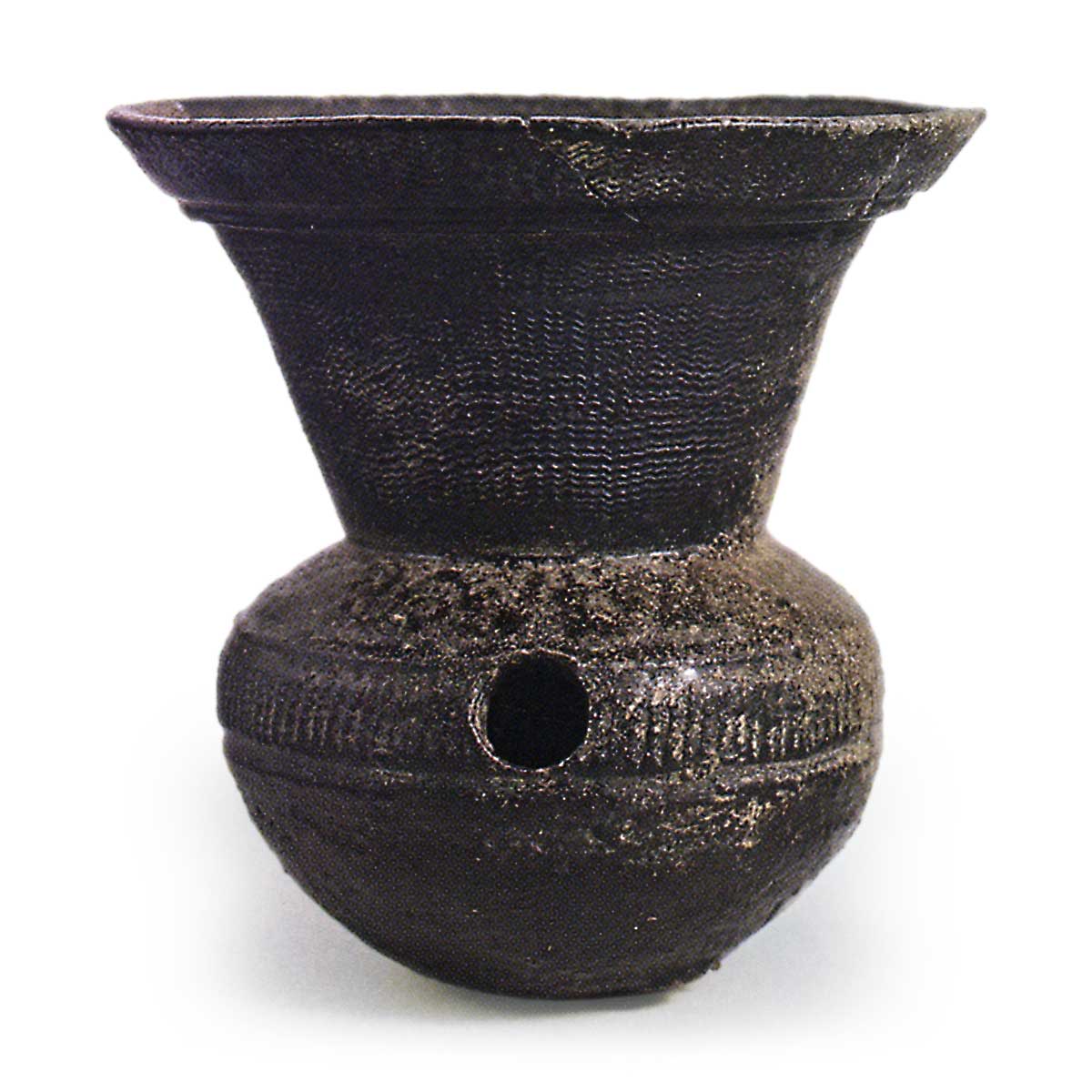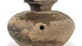 須恵器 𤭯 日本須恵器 𤭯 2024.12.11 須恵器 𤭯 岐阜县养老郡上石津村二俣一号古墓出土6世纪高13.5厘米,直径13.2厘米,瓶身直径10.2厘米名古屋大学考古研究实验室从6世纪初开始,𤭯的瓶口与瓶颈的比例在2比1到3比1之间,瓶颈仍然很粗。 口部和颈部通常装饰有精美的梳状波纹。该器皿的陶土主体呈螺旋状,通过敲打和刮削成型。烧制效果良好,由于烟熏烧制还原,整个器皿表面呈现黑色光泽,肩部带有深绿色天然釉。
