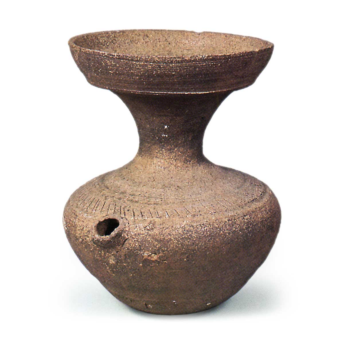 須恵器 𤭯 日本須恵器 𤭯 2024.12.11 須恵器 𤭯 爱知县丰川市住谷烧平12号古墓出土7世纪高14.1厘米,直径10.5厘米,瓶身直径10.9厘米一宫町教育委员会到了7世纪中期,瓶口形状已变为紧箍状,直径接近瓶身直径。唇缘装饰依然清晰可见,但开始出现填满的趋势。瓶身中央的刻线与梳齿纹消失了,图案退化,如这件作品,图案仅延伸到肩部。