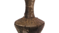 須恵器 台付長頸瓶 日本須恵器 台付長頸瓶 2024.12.11 須恵器 台付長頸瓶 爱知县一宫市浅井19号古墓出土7世纪高27.5厘米,口部9.6厘米,瓶身16.0厘米,底座10.9厘米一宫市教育委员会半球形的器身肩部较宽,装饰有两条刻线以及梳齿状图案,但底部较低,台阶也已退化,仅在三个侧面留有一块矩形镂空板。颈部的刻线也已消失。该器皿由含铁量高的粗陶土制成,在接近氧化的温度下烧制而成,器皿棕红色的表面覆盖着一层厚厚的深绿色天然釉。这是7世纪中叶的典型器皿。