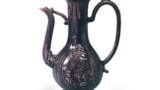 半球形的器身肩部较宽,装饰有两条刻线以及梳齿状图案,但底部较低,台阶也已退化,仅在三个侧面留有一块矩形镂空板。颈部的刻线也已消失。该器皿由含铁量高的粗陶土制成,在接近氧化的温度下烧制而成,器皿棕红色的表面覆盖着一层厚厚的深绿色天然釉。这是7世纪中叶的典型器皿。