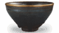 此碗也是用含少量铁的粘土制成的,黑色釉料涂得很厚,内外都有漂亮的油斑。碗身厚重,口大,边缘略呈弧形,足部低矮,带有小环。