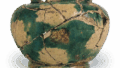 无釉的器身由致密的灰白色粘土精制而成,三色釉为绿色釉,在重叠弧线的交点处施以棕色釉,这是同一时期常见的。虽然半釉表面的某些部分已经变成银色,但这件作品的状况仍然非常好。