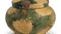 二色小壶 三彩釉二色小壶 2025.01.16 二色小壶 二色小壶 从冲之岛(福冈县宗像市)出土8世纪高6.0厘米,口直径3.6厘米,瓶身直径6.8厘米,瓶底直径3.1厘米宗像大社这是从1号遗址出土的三只双色平底小罐之一。边缘略微向内倾斜,器身较长,没有肩部隆起。该器皿底部有旋转的螺纹切割痕迹,但还有单独的静态螺纹切割痕迹。它涂有绿色釉,带有交错弧形图案。它是通过刮削形成的。它是同一考古遗址出土的三色和双色小罐中最新的一件,可能来自平安时代早期。