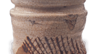 壶口下方有一个小颈环,做工精细,因此人们认为它属于这种梅瓶的早期作品。 略微鼓起的肩部和逐渐变窄的底部也是旧式样中的典型特征。鱼的设计采用所谓的“追逐”风格,三条鱼骄傲地面对表面。每条鱼之间的空间都填满了短波设计。鱼的嘴呈V形张开,胸部很大,尾巴很细,流畅的线条完美地展现了动态的外观。 清水古窑出土了多件与这件作品相同的灰釉鱼纹陶器,据推测它们出自同一窑炉。在古濑户图案中,鱼纹是最受欢迎的图案之一,但这件作品是唯一一件完整的(部分边缘缺失),其精美的表面与稳定的黄绿色灰色釉面相得益彰。