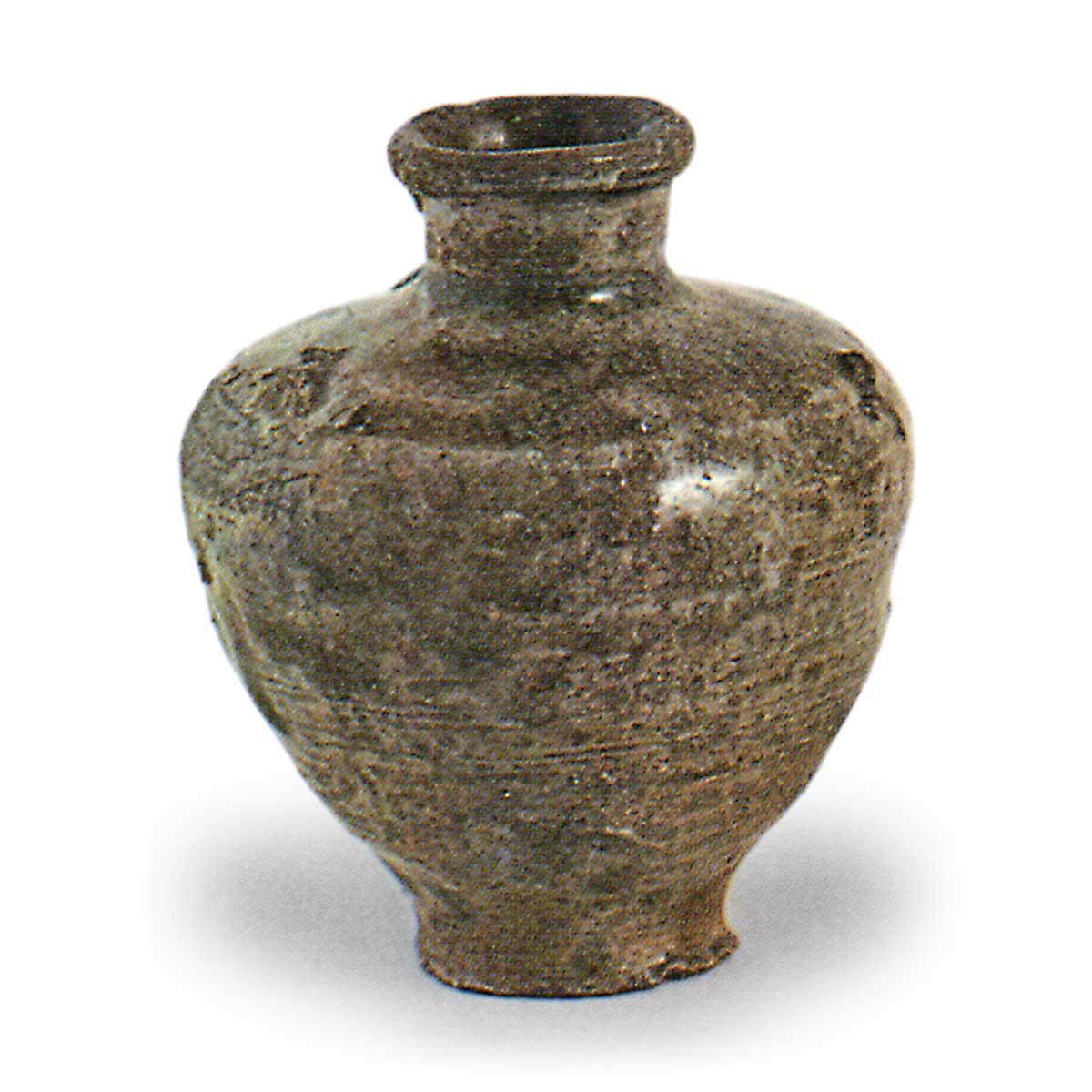 像这样的小罐子在古濑户的早期作品中经常出现,从它们的形状来看,它们可能是以灰釉四耳罐为原型。这些小罐子是用来做什么的尚不清楚,但一些稍大的罐子被用作骨灰瓮,从和歌山县高野山奥之院墓地的出土文物中,我们知道它们是用来存放死者的骨灰的。这是因为在高野山,最初的做法是埋葬死者,而火化的遗骸是从各地运来的。 如果是这样的话,这些小罐子也是用于这个目的吗?它们是用水力陶轮制作的,罐子的背面仍然有切割的痕迹。灰釉的颜色是淡绿色的,如果只用灰制作,灰釉会很薄。