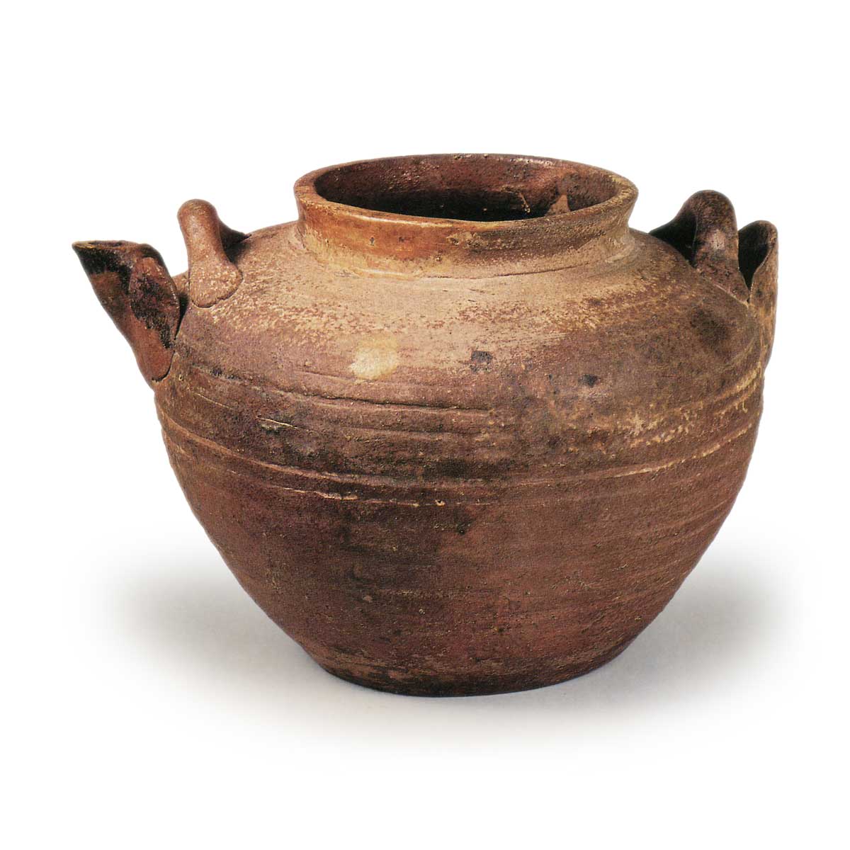 提到陶制茶壶,人们通常会想到用于煮茶或泡药的日常容器,它们并不特别引人注目。提到古濑户,人们通常只会想到经过药物处理的硬质陶器,但它们也生产了大量其他陶器,如花器。这类陶器通常在窑中烧制,烧制后质地较软,以适应其功能。这件陶器出土于金松窑,其历史可追溯至15世纪中叶,让我们得以一窥当时的日常生活。 它采用连续注水法制作而成,表面粗糙,有明显的褶皱。肩部有挂环,而且它有耐火外层,符合桥烧的制作方式。器皿表面覆盖着铁釉。
