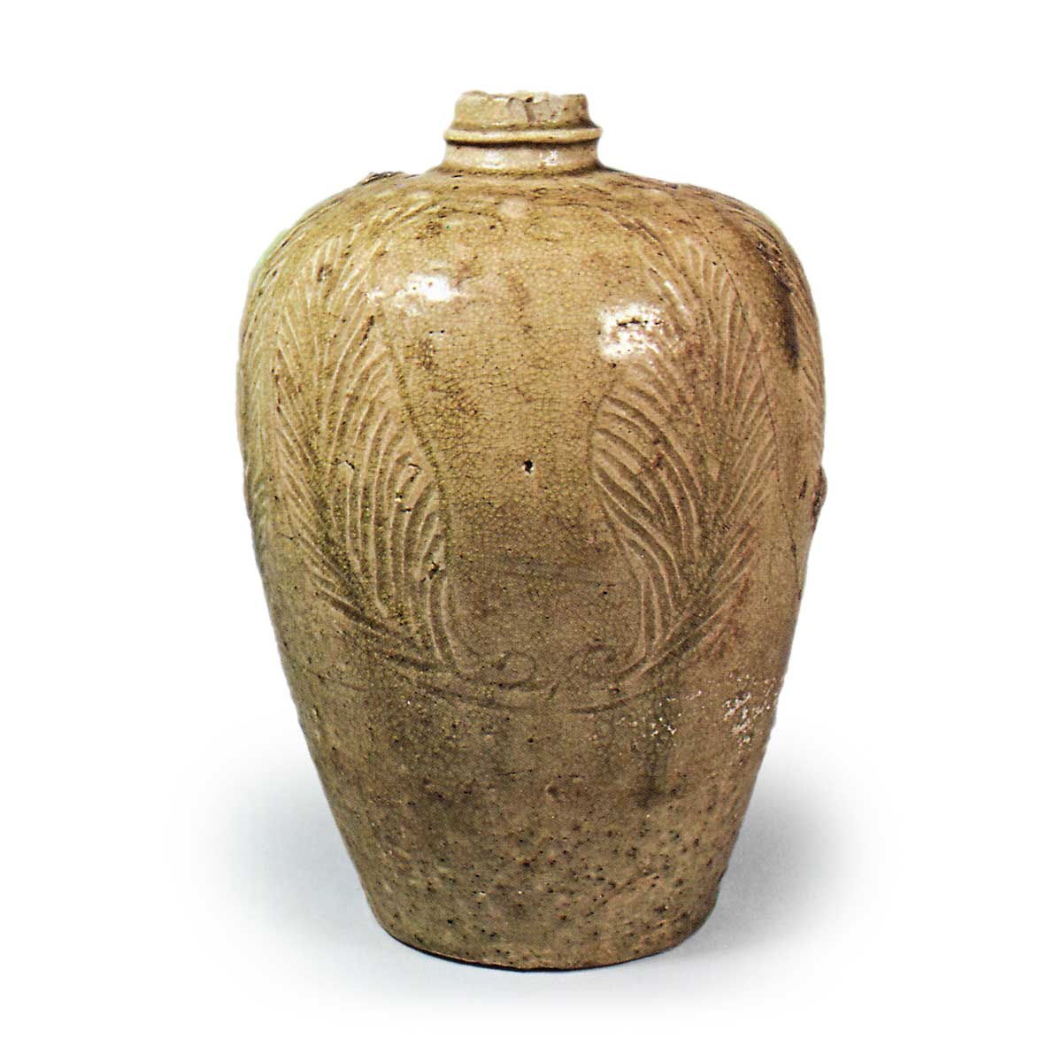 瀬戸灰釉花卉纹瓶 日本瀬戸灰釉花卉纹瓶 X Facebook Hatena Bookmark LINE Pinterest 复制 2025.02.10 瀬戸灰釉花卉纹瓶 出土于香川县茅崎市14世纪高23.8厘米,瓶身直径16.5厘米这是一只造型粗犷的梅瓶,肩部轮廓分明,底部较大。瓶颈处有一圈凸起的装饰,略低于瓶身中央。这是梅瓶中较新的形式。瓶身中央一对对生着两片大叶子。 厚实的圆雕工艺和花卉图案与器形和时代相匹配。灰釉呈现出稳定的釉色,并略微氧化,呈现出黄绿色。