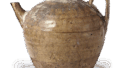 瀬戸灰釉手绘花卉图案水壶 日本瀬戸灰釉手绘花卉图案水壶 2025.02.24 瀬戸灰釉手绘花卉图案水壶 14世纪高8.8厘米,直径4.3厘米,壶身直径8.5厘米,底座直径6.4厘米从镰仓时代后期开始,人们制作了许多类似这种小水壶。这是由于日常使用的容器种类繁多。壶把采用模具制作。壶肩印有菊花图案。灰釉厚实,呈现出美丽的亮绿色调。