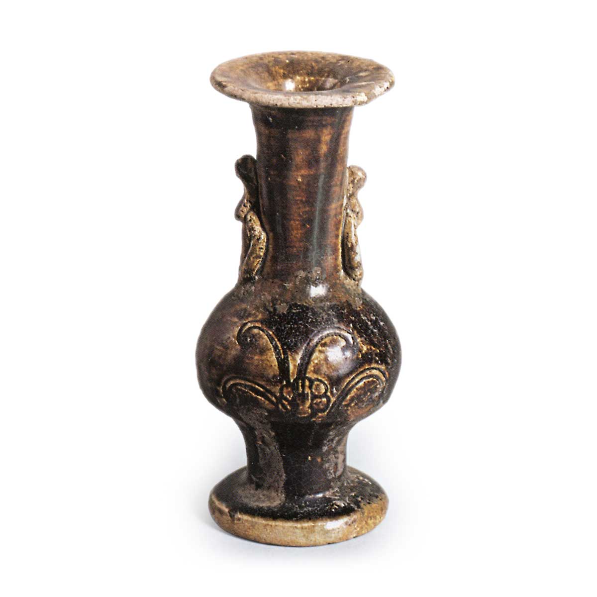 瀬戸铁釉印花花卉花瓶 日本瀬戸铁釉印花花卉花瓶 2025.02.24 瀬戸铁釉印花花卉花瓶 爱知县濑户市窯元町百目窯出土14世纪高17.2厘米,口6.0厘米,瓶身8.7厘米,底座6.5厘米这是伊万里烧鼎盛时期非常典型的佛教花瓶。瓶身扁平鼓起,足部较高。伊万里图案靠近瓶口底部,上下各有两个圆形图案,瓶身正面和背面有牡丹花纹。铁釉呈蓝黑色,覆盖整个表面。