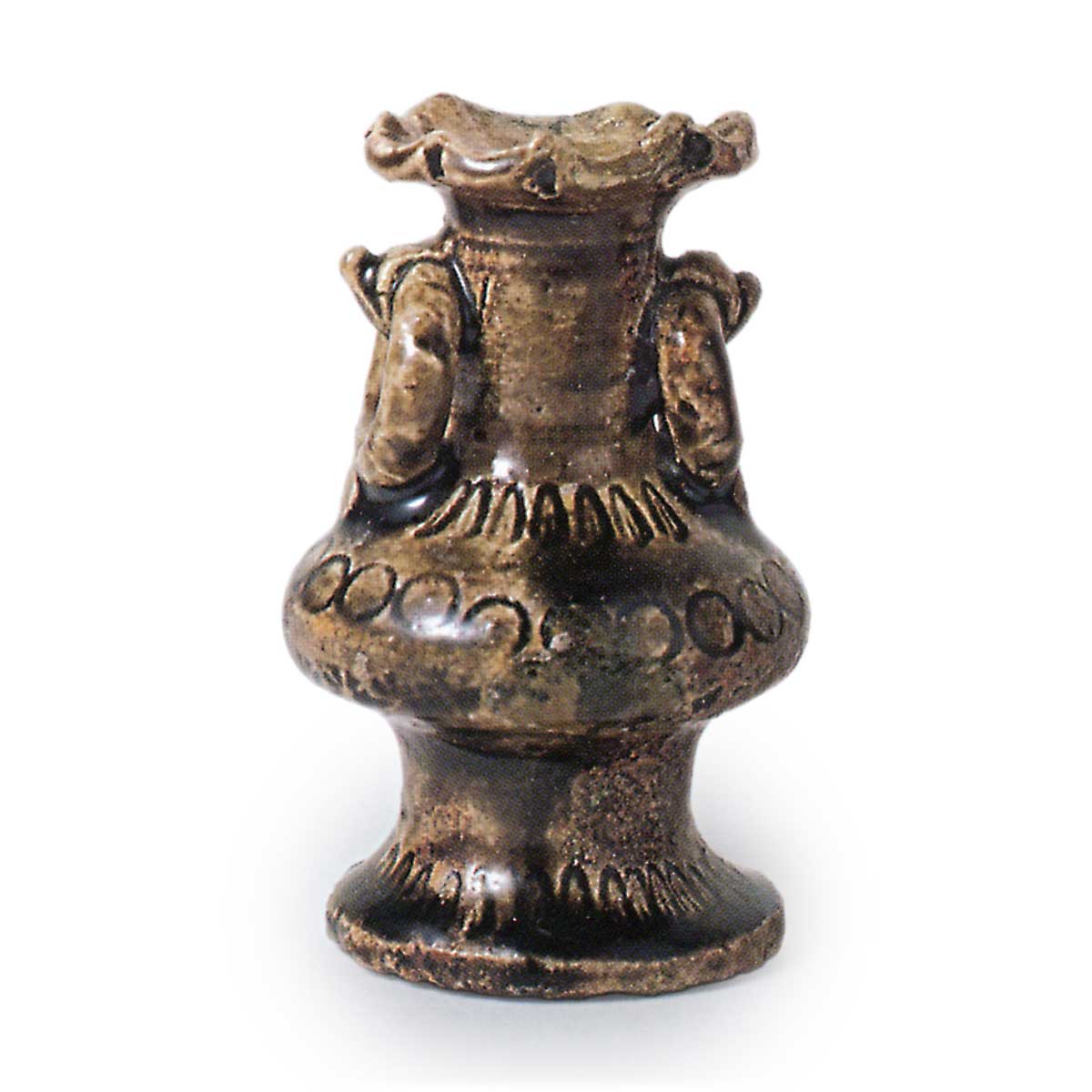 瀬戸铁釉印花花卉花瓶 日本瀬戸铁釉印花花卉花瓶 X Facebook Hatena Bookmark LINE Pinterest 复制 2025.02.24 瀬戸铁釉印花花卉花瓶 14世纪高7.8厘米,口直径3.6厘米,瓶身直径4.6厘米,底部直径4.1厘米这是一件伊万里烧鼎盛时期的佛教花瓶,可能是精确表现每个部分的最小花瓶。唯一不符合比例的是花瓶口周围的大环,它给花瓶带来了不和谐感。伊万里烧的花纹由二十个圆形图案组成,位于扁平瓶身的中央,十四个小花瓣形图案位于肩部,三十六个图案环绕在底部。