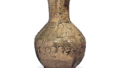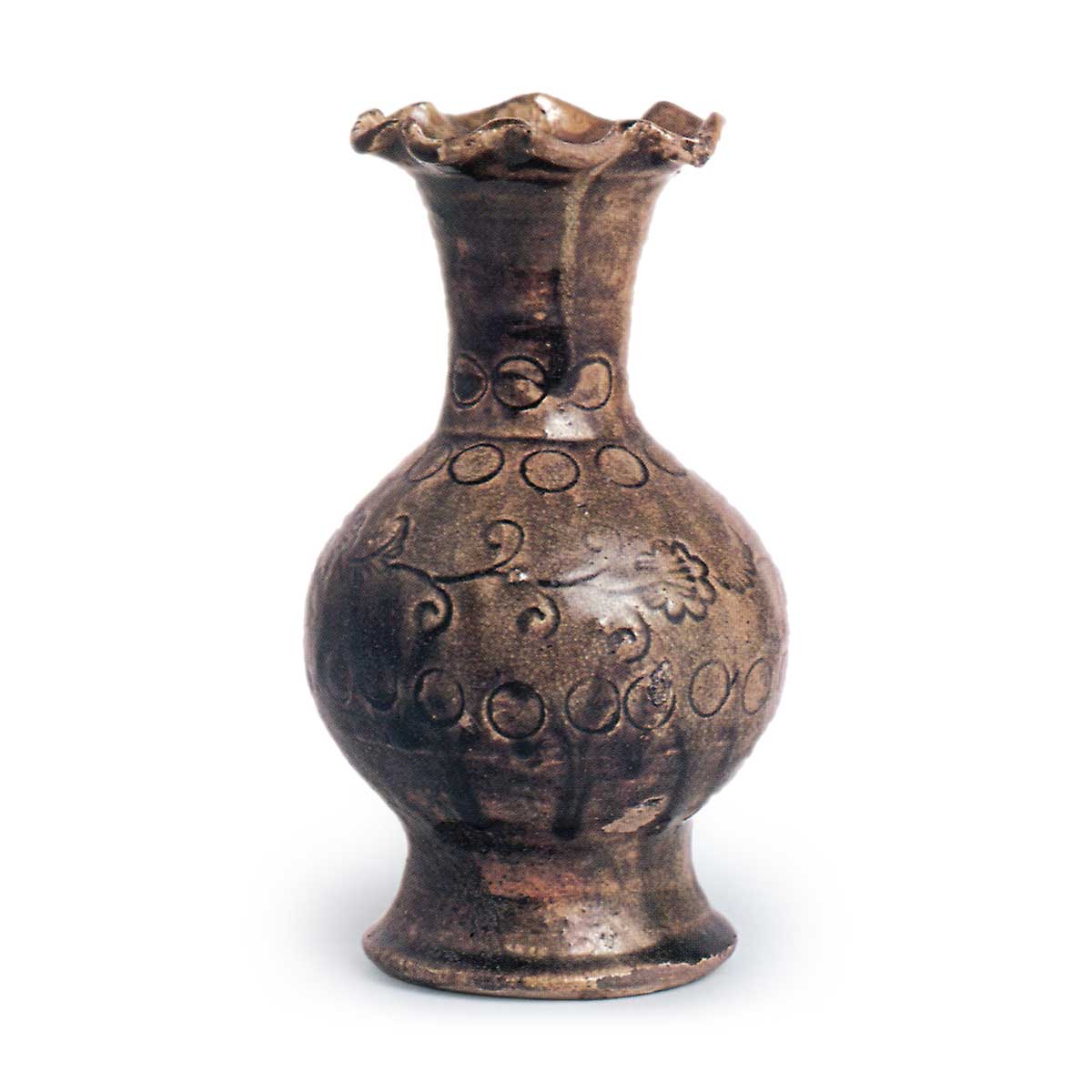 瀬戸铁釉印花花卉花瓶 日本瀬戸铁釉印花花卉花瓶 2025.02.24 瀬戸铁釉印花花卉花瓶 14世纪高21.4厘米,直径9.3厘米,瓶身直径12.0厘米,底座直径9.2厘米名古屋市博物馆通常被称为长型花瓶,这是一种佛教花瓶。它是一个大花瓶,有一个百合花形的嘴和一个低矮的底座。印花图案由嘴底部和身体上下部分的圆形图案组成,中间是山茶花图案,由蔓藤花纹连接。铁釉呈蓝黑色。