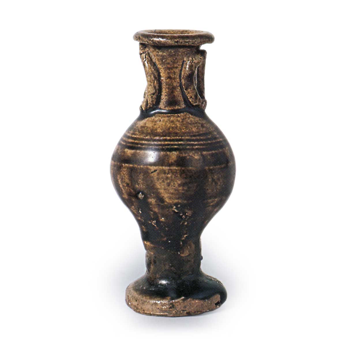 瀬戸铁釉花瓶 日本瀬戸铁釉花瓶 2025.02.24 瀬戸铁釉花瓶 14世纪高10.2厘米,直径3.0厘米,瓶身直径4.4厘米,底座直径3.5厘米这是小濑户时代鼎盛时期最简单的铁釉佛教花瓶。瓶身呈椭圆形,上半部分绘有一道线纹。铁釉呈暗棕色,釉层较薄,下半部分有很多不平整的地方。