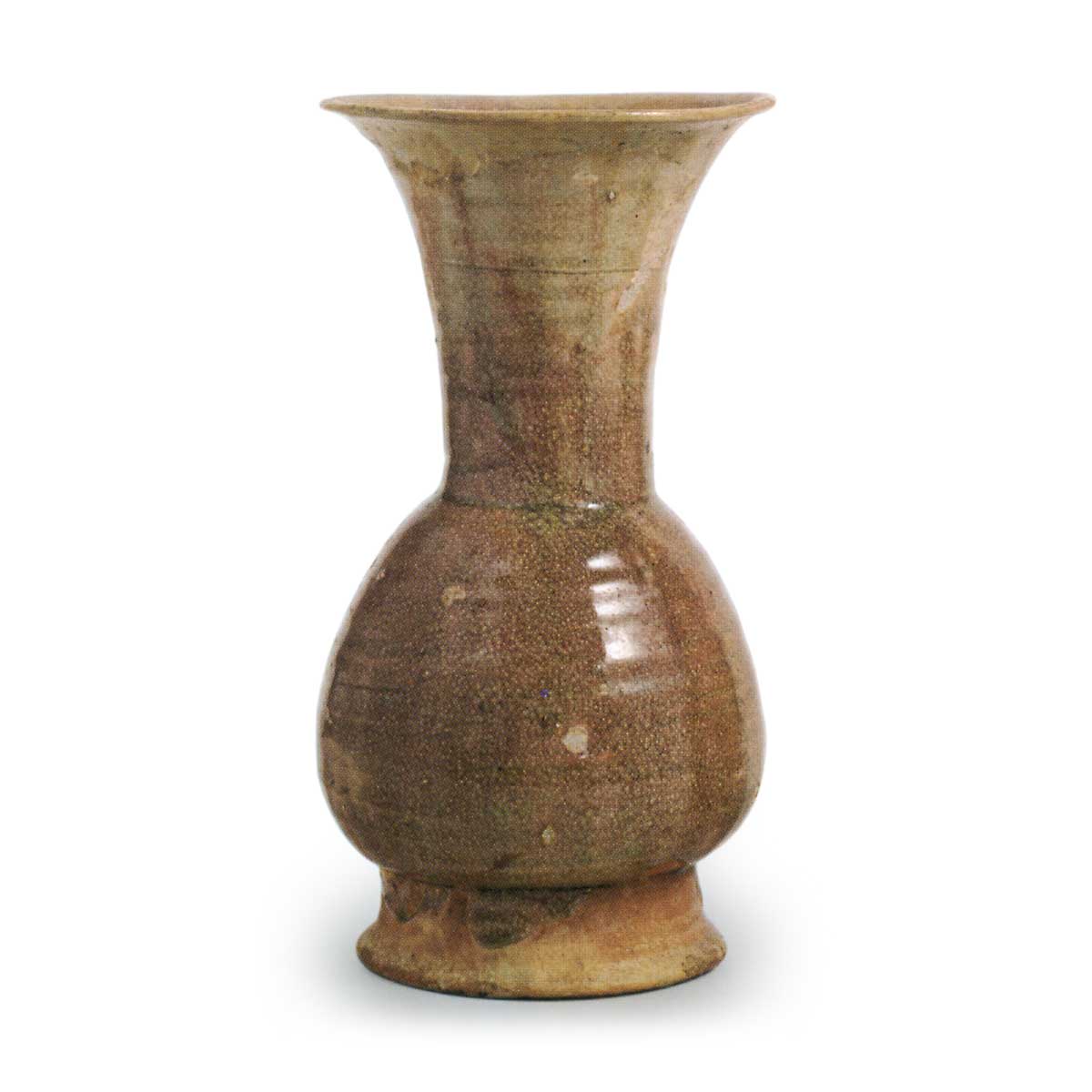 瀬戸灰釉花瓶 日本瀬戸灰釉花瓶 2025.02.24 瀬戸灰釉花瓶 14世纪高24.8厘米,口直径13.4厘米,瓶身直径13.4厘米,瓶底直径10.8厘米室町时代,随着陶轮技术的进步,人们可以制作出大型薄壁器皿,因此开始生产敞口花瓶。这款花瓶沿用了前代花瓶的形状,但口部像喇叭一样敞开着。花瓶的陶土呈黄白色,略带粗糙,釉面光滑,呈黄绿色,融合得很好。