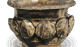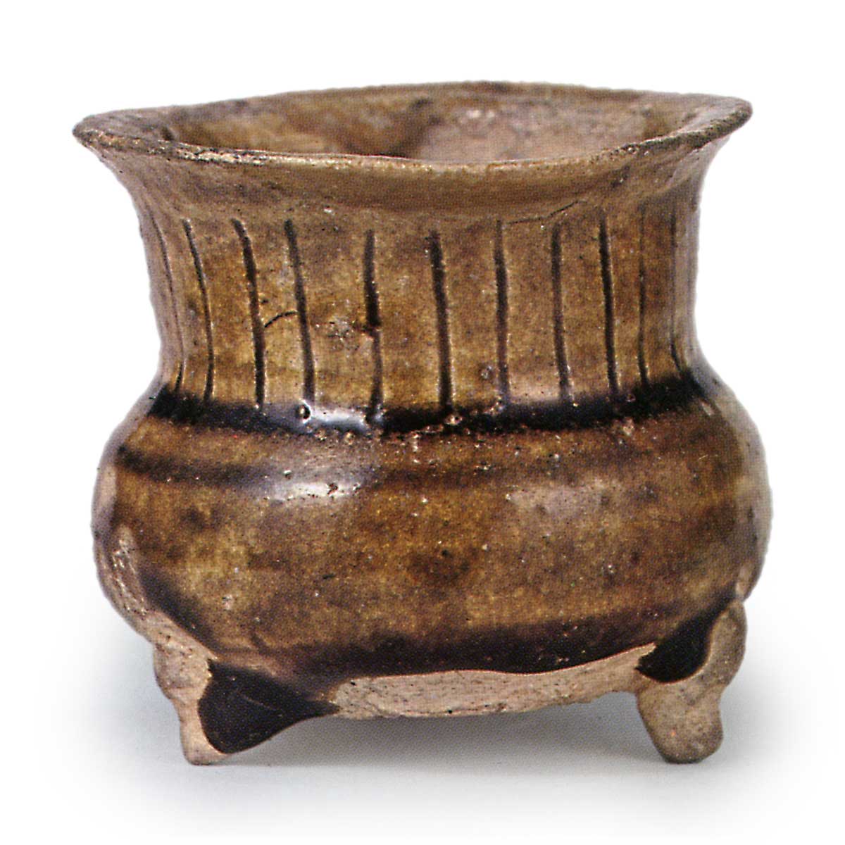 这件作品属于香炉系列,制作于 14 世纪中叶,也就是窑洞时代的鼎盛时期。 它的尺寸相当小,口部的形状与标准型相比有很大的变化。 它由黄白色、相当粗糙的粘土制成,头部装饰有凹陷的线条。 除底座和三足外,整个表面都施有铁釉,氧化烧制后呈黄褐色。