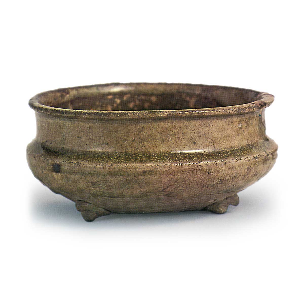 瀬戸灰釉香炉 日本瀬戸灰釉香炉 X Facebook Hatena Bookmark LINE Pinterest 复制 2025.02.25 瀬戸灰釉香炉 15 世纪。高 5.8 厘米,直径 11.2 厘米。 室町时代(1336-1573 年),随着口沿的退化,香炉的形状开始变得扁平,直径变大。 这件灰釉香炉可追溯到 15 世纪早期,炉身呈浅碗状,颈部仍然直立。 三足也已退化,现在很小,贴在炉身背面。 灰釉施于整个表面,只留下底座和三足的底部,呈墨绿色。