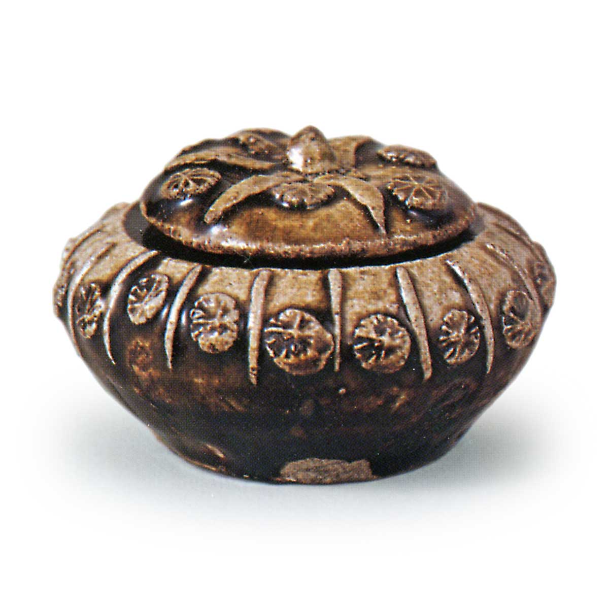 瀬戸铁釉花卉纹容器 容器瀬戸铁釉花卉纹容器 X Facebook Hatena Bookmark LINE Pinterest 复制 2025.02.25 瀬戸铁釉花卉纹容器 出土于爱知县濑户市基尔加多库特洞窟。14 世纪。(盖)高 1.4 厘米(身)高 3.4 厘米(碗直径 2.9 厘米,身直径 6.7 厘米,底直径 3.8 厘米)。 这是科塞托时期(即 14 世纪中叶)最鼎盛时期的一件华丽作品。 器身由粘土线绳粘贴而成,呈放射状,其间有圆形图案,一般尺寸较大。 这些粘贴的花卉图案大多是铁釉的。