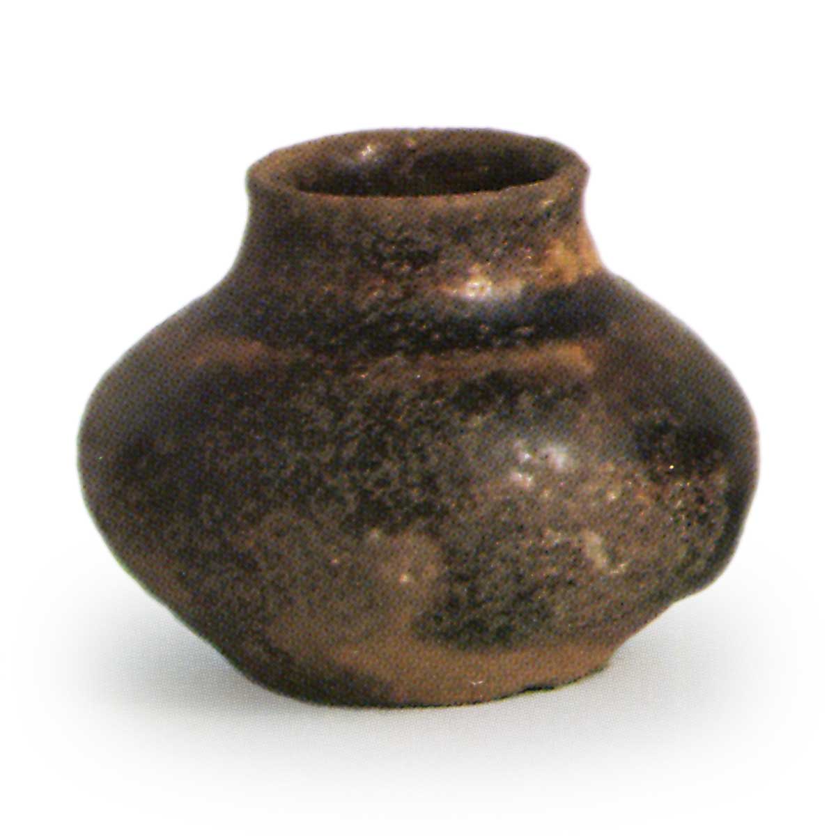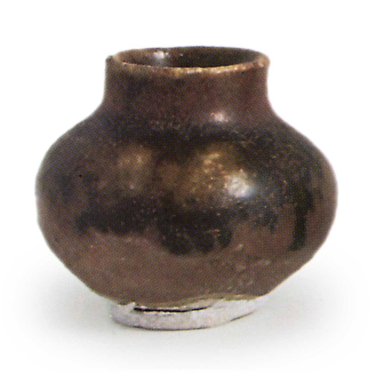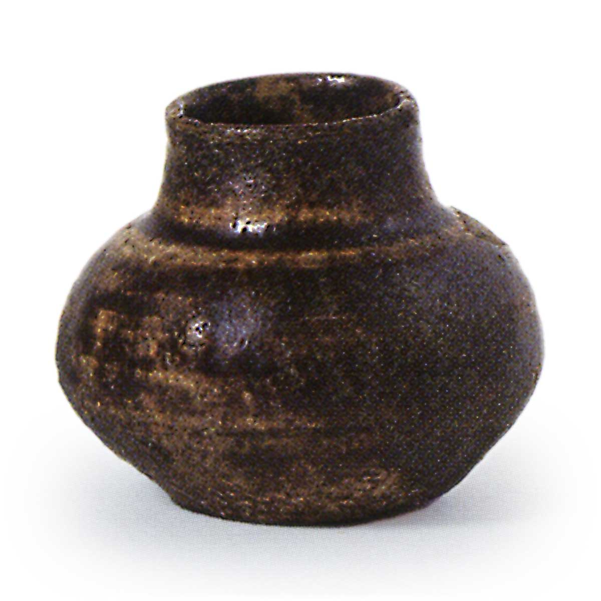 大约从镰仓时代末期开始,濑户窑开始使用所谓的祖母泥生产小型铁釉器。 最早的例子是隐岐狩窑,在该窑出土了一个大型底座,上面刻有 1324 年的铭文,之后产量逐渐增加,有些窑从 14 世纪晚期开始大量烧制。 这些铁釉小罐在濑户也被称为 mameharu。 很容易推测这些小罐是作为茶叶容器而制作的,因为与它们同时烧制的还有天目茶碗。 很明显,这些小罐子是用当时被尊称为中国制造的茶叶容器的舶来品制成的,其中许多罐子与《崑台观城记》和其他文献中描述的各种形式的抹茶春相似。 特别是,早期的小花瓶中常见的形状是圆茄子(maru-nasu)和萝蒂(rotei)。 这些小花瓶最终发展成为 15 世纪的日本茶壶,主要由因普大社制作。