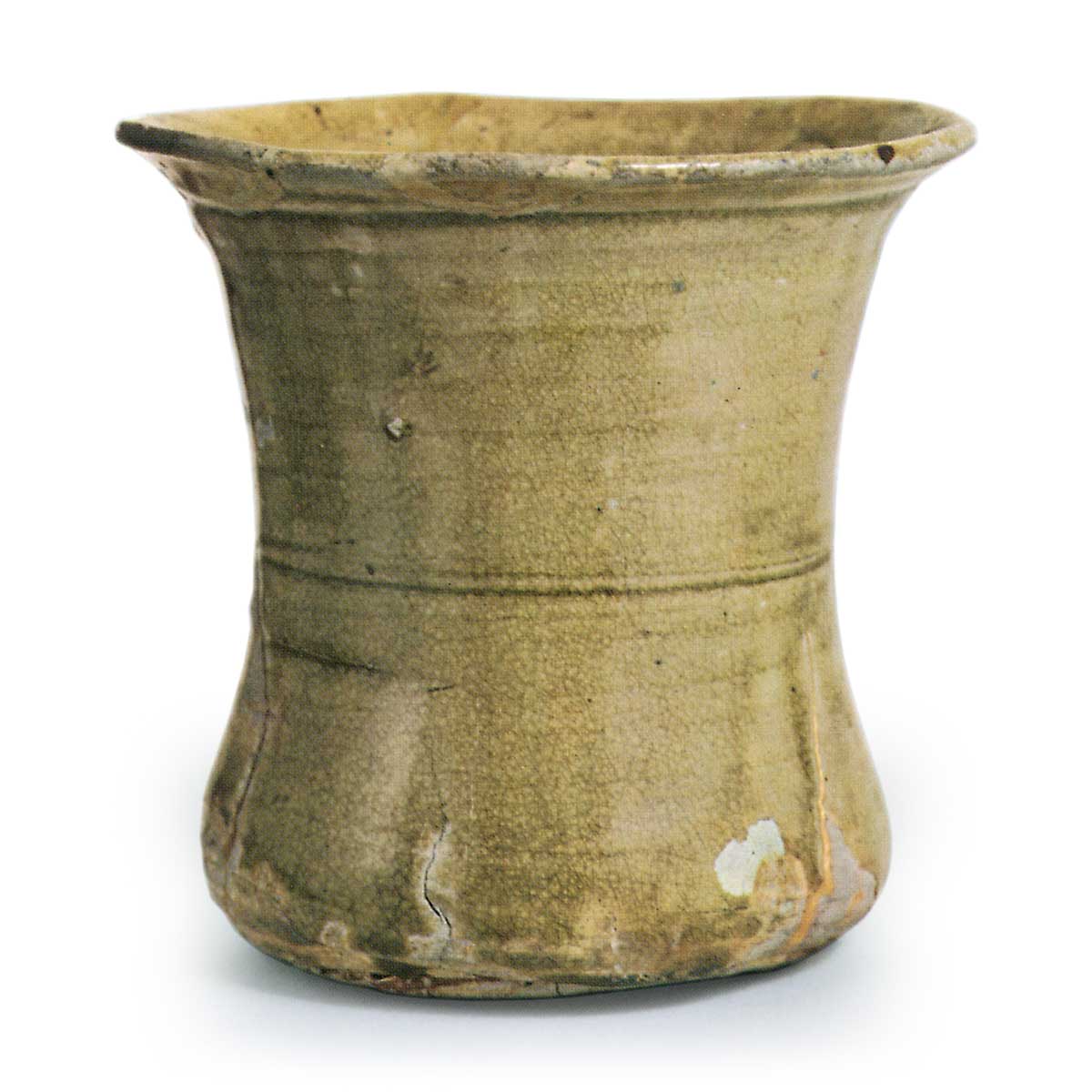 15 世纪上半叶至中叶制作的圆柱形器皿,口部呈翘曲状,器身中部呈挤压状。 有人认为它可能是一个水罐。